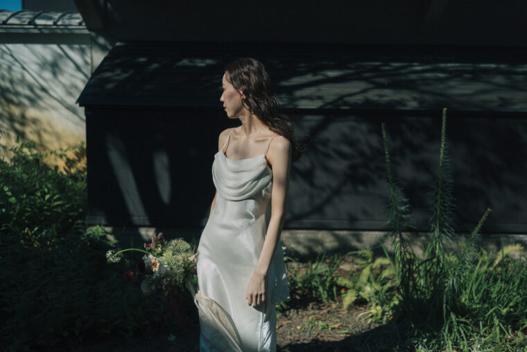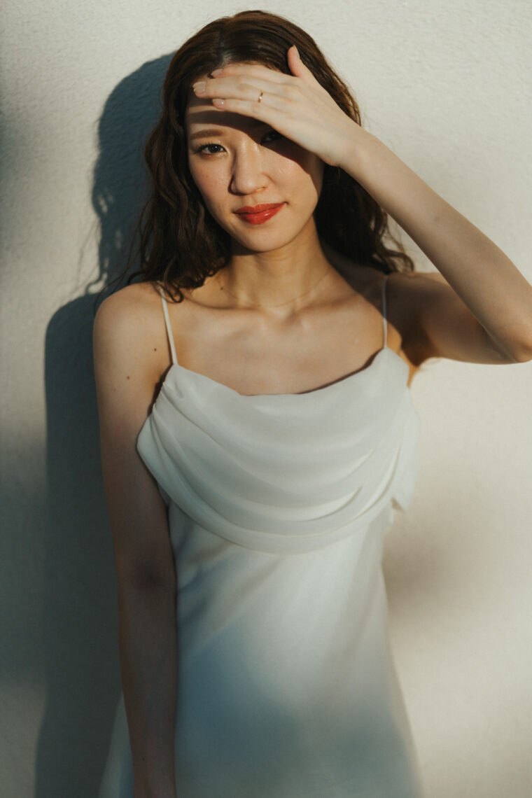 体にそっと添うようなスレンダーなシルエットはソフトマーメイドに近く、