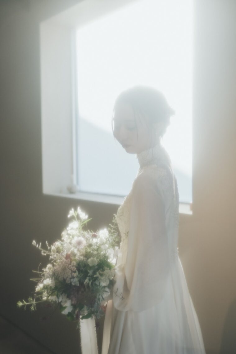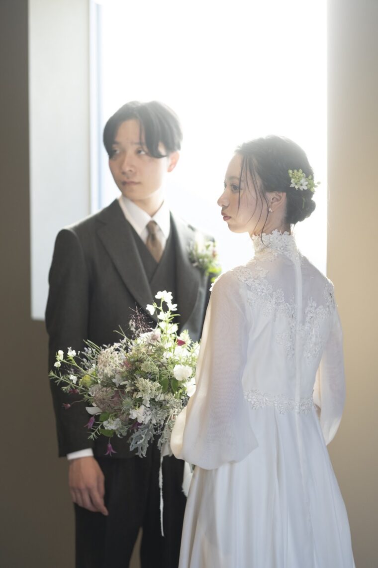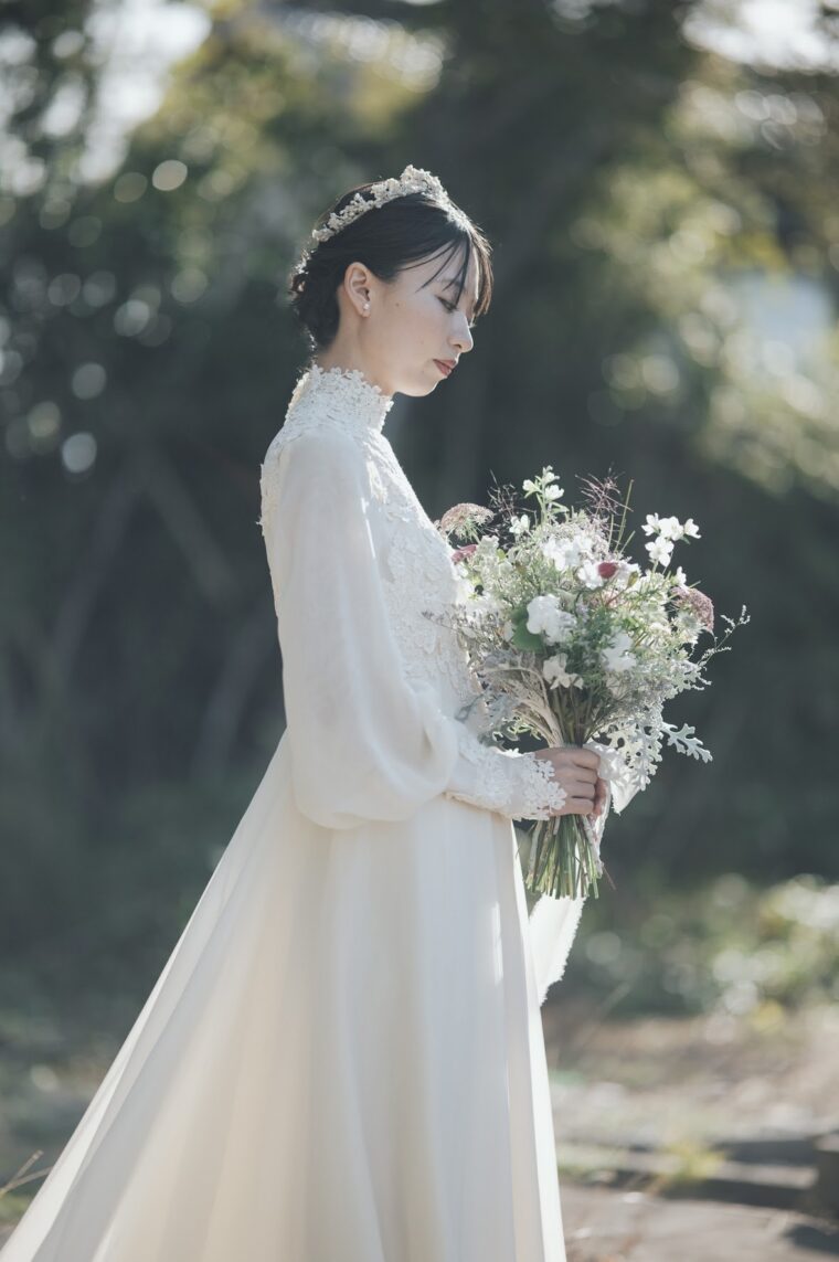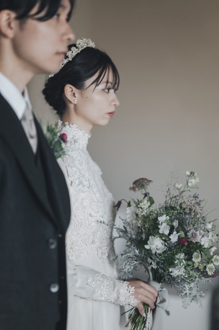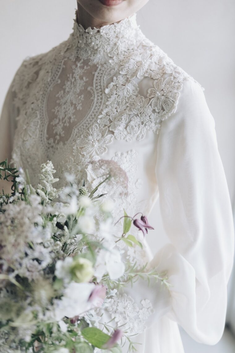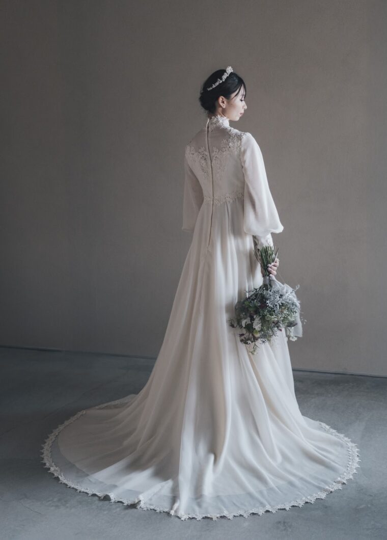 花嫁様が選ばれたのは、クラシカルなハイネックロングスリーブのヴィンテージドレス。