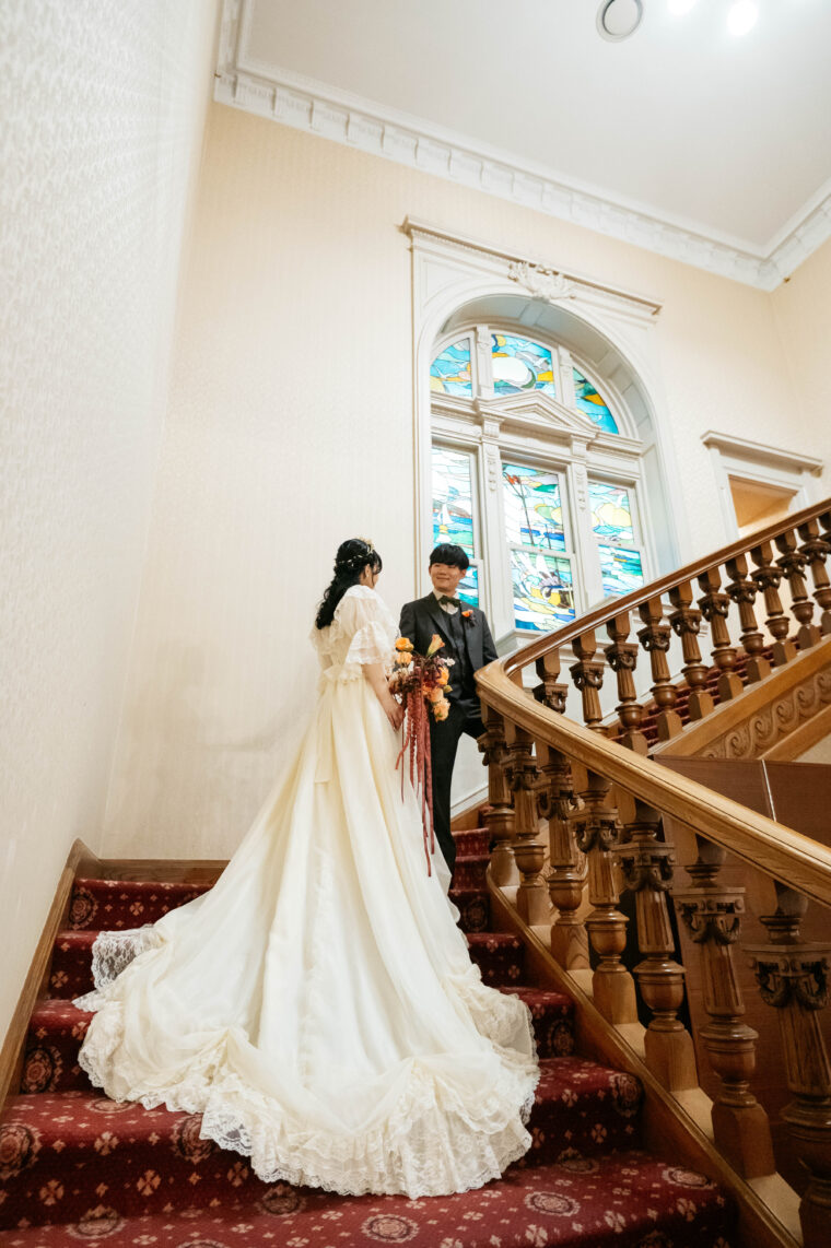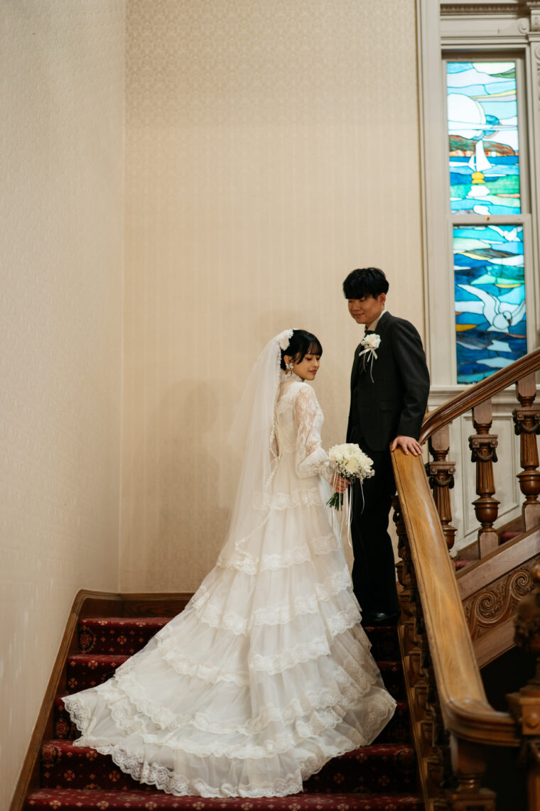 挙式でお選びいただいたのは、気品溢れるロングスリーブのヴィンテージドレス。