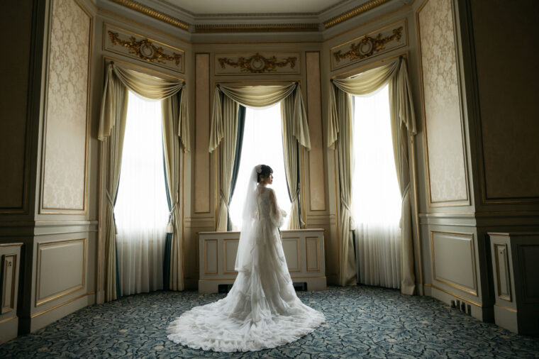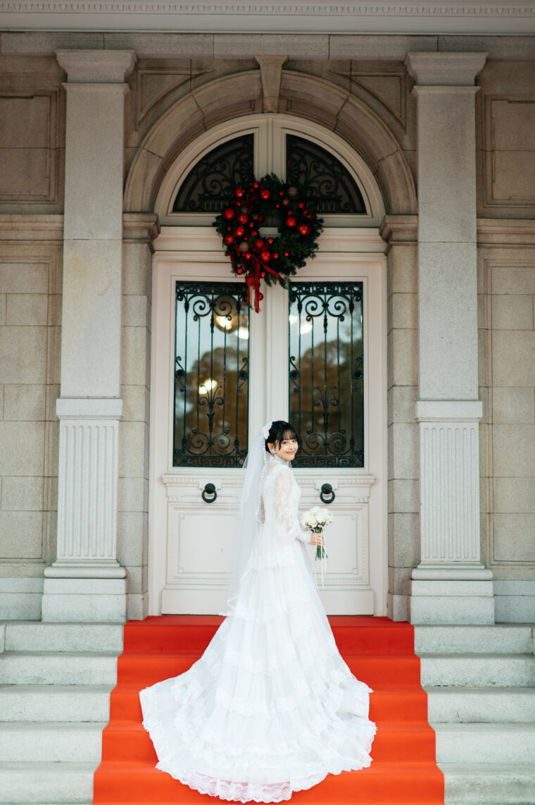 ボンネを添えたレトロなベールが、花嫁様の凛とした美しさを引き立てます。